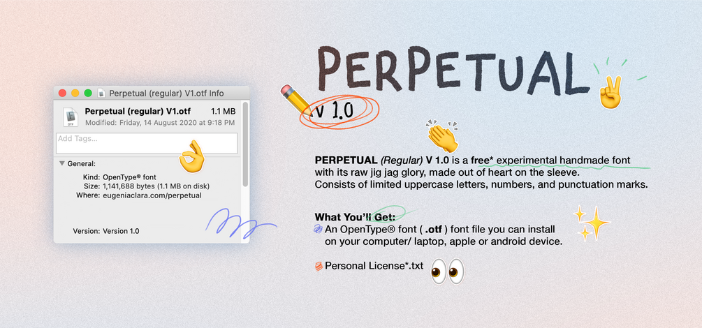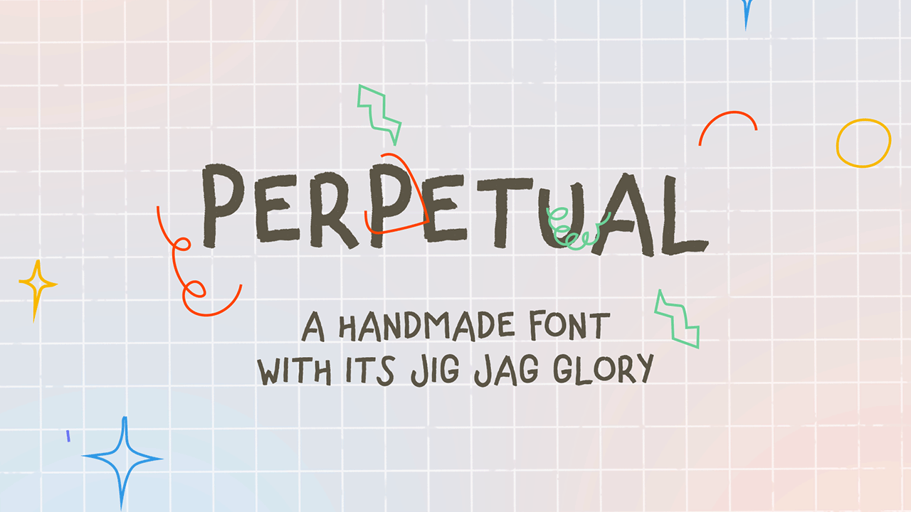 Perpetual (Regular) v1.0 is an experimental handmade font with its raw jig jag glory. Consists of limited uppercase letters, numbers, and punctuation marks — for now.